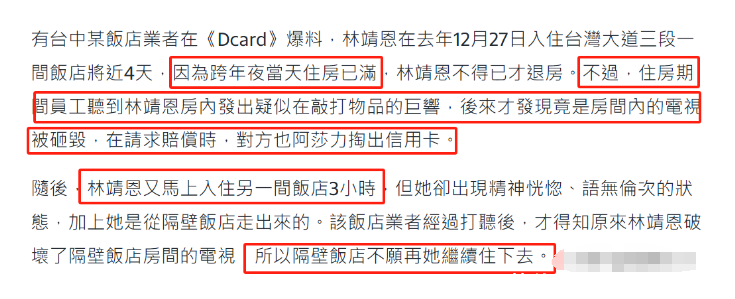 自后林靖恩又找了一个旅舍,在27号的时期办理了入住,但是又退房了,在使命主谈主员查验的时期,就发现旅舍里的电视机仍是被砸了!